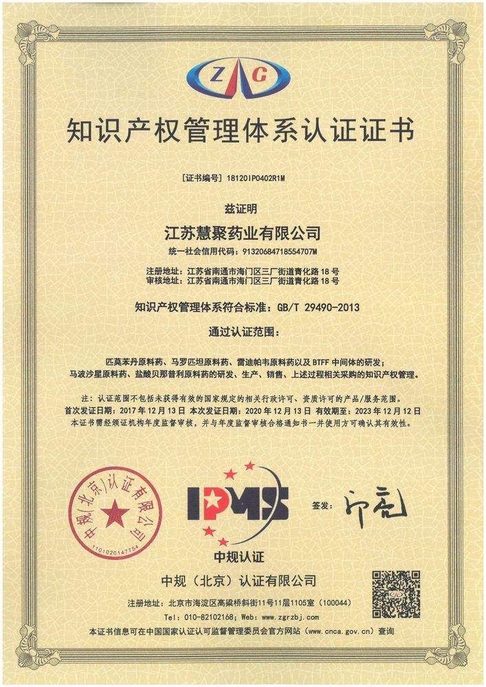 2020年12月3-4日,中规(北京)认证有限公司审核专家组对公司进行为期两天的知识产权管理体系再认证审核,此次再认证审核,专家组对我公司知识产权管理体系运行的适宜性和有效性给予认可和肯定,最终网投官网_网投官网(中国)药业顺利通过此次再认证。未来,我公司将继续贯彻《企业知识产权管理规范》,促进知识产权创新发展意识的提高,增强对专利、商标等知识产权的应用和保护能力,将网投官网_网投官网(中国)药业打造为知识产权意识强、创新意识强、产业化效益显著和专业人才齐全的创新型企业。